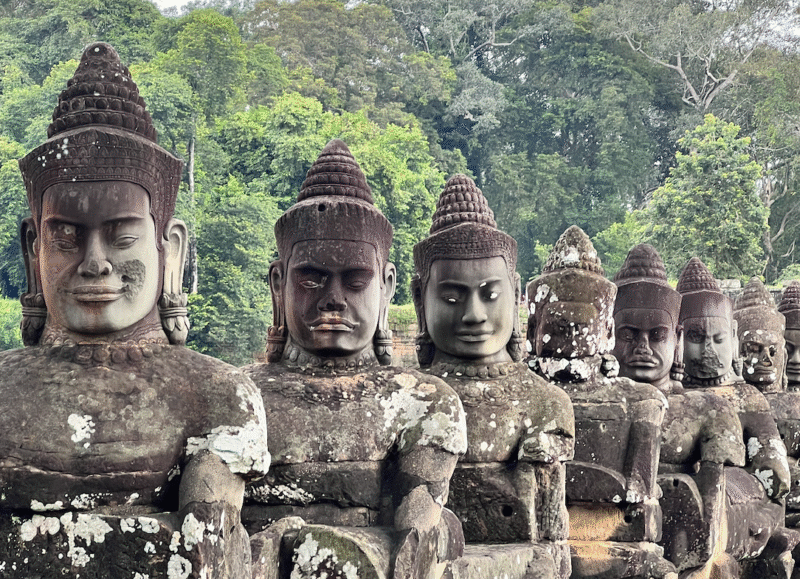 まずは石像が残る南門。東西南北あるのですが、頭部が綺麗に残っているのがこの南門。参道には石像がずらりと並び、アンコールトムへの門へ誘ってくれます。