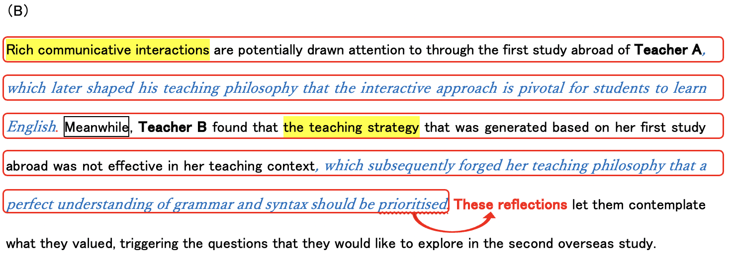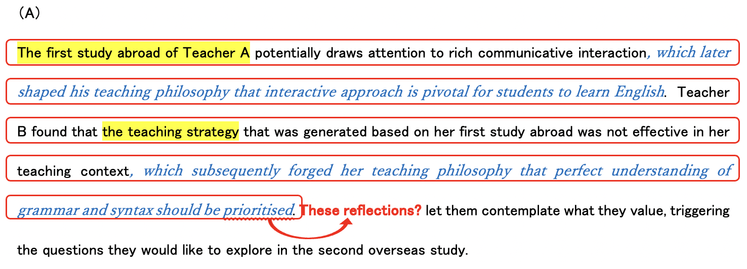 Rich communicative interactions are potentially drawn attention to through the first study abroad of Teacher A, which later shaped his teaching philosophy that the interactive approach is pivotal for students to learn English. Meanwhile, Teacher B found that the teaching strategy that was generated based on her first study abroad was not effective in her teaching context, which subsequently forged her teaching philosophy that a perfect understanding of grammar and syntax should be prioritised. These reflections let them contemplate what they valued, triggering the questions that they would like to explore in the second overseas study.