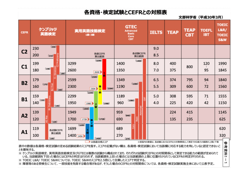 これは文部科学省が平成30年(2018年)に示した各資格や検定とCEFRの対照表です。これを踏まえてアカデミックライティングに通じる語彙の目安表を、僕の方で新たに作成しました。